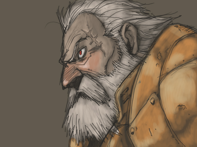髪は既に白髪、立派な髭面。